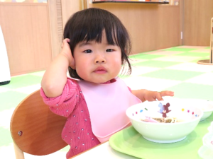 “給食 給食 嬉しいな~♪”とお歌をうたって、うどんを上手に自分でお口に入れていきます。
