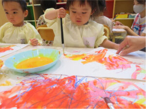 クレヨンでお絵描きをした画用紙の上から赤、黄の絵の具をぬりぬり。