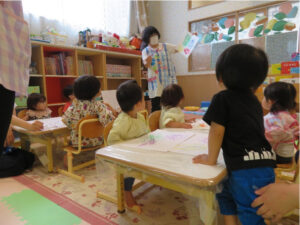 保育者がお話をはじめると興味津々にきく子どもたち。