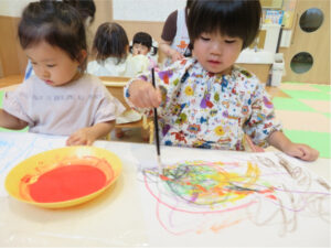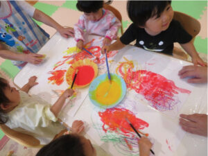 筆にしっかり絵の具をつけ、すべらせるように夢中で塗るこどもたち。