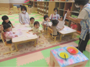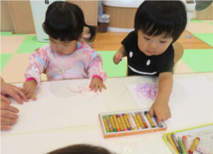 塗った下から、クレヨンで描いたお絵描きが浮き出てくるのを「あれー」と不思議そうに見ている子も。