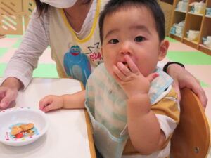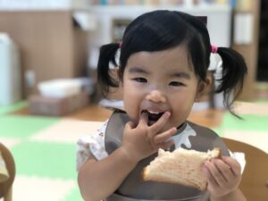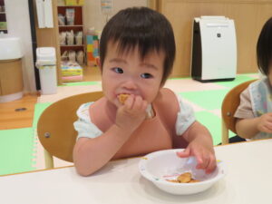 “いただきます“のおうたを歌い終わるとすぐにおやつに手を伸ばします(笑)