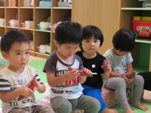 にじ組(2歳児クラス)さんは、自分たちでお目目を描きました!