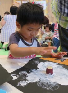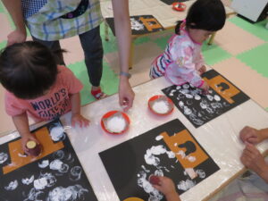半分に切ったサツマイモをスタンプにして、白い絵の具をつけ、