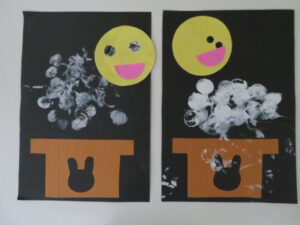 お顔の付いたお月さまをくっつけて、素敵なお月さまとお月見団子の完成です!