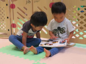 Sくんにも見えるように絵本を開いて座りました。