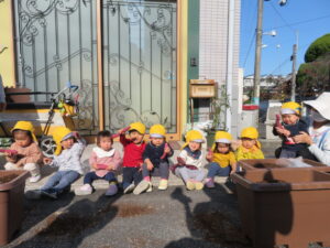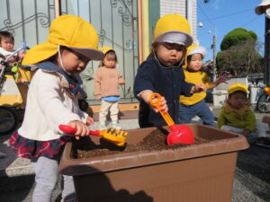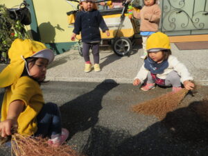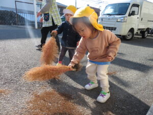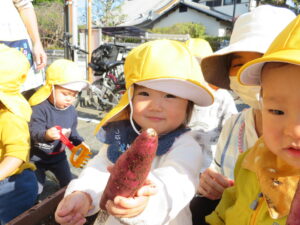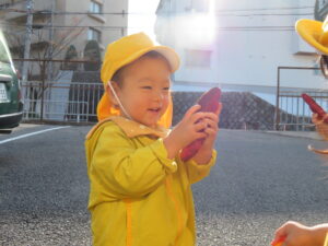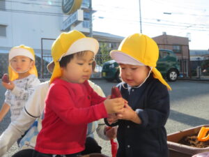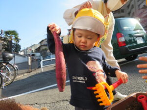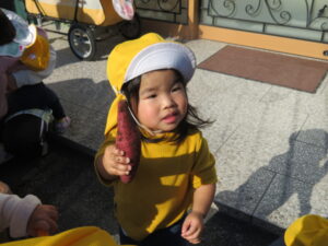 スタッフブログ おいもほりのようす 12/09/2021 01/31/2022 Facebook Twitter はてブ 保育園でお芋ほりごっこをしました♪ コキアが育っていた玄関先のプランターに、何やらお芋のツル(らしきもの)が… ツルの下に、お芋がかくれているかも!? スコップや手で土を掘っていくと、、、 「あ!おいもさん、みつけたー!!」 土の中からお芋が少し見えても、不思議そうに眺めて、なかなか掘り出そうとしない子も^_^; お芋を持って、はい、チーズ^_^☆ お芋ほりを楽しんだ後は、コキア(ほうき草)を使ってみんなでお掃除もしましたよ。 Facebook Twitter はてブ