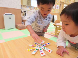 好きな色のシールをまとめて貼る子、均等に並べて貼る子、