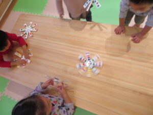 底にペットボトルのキャップを付け、完成したコマをまわして楽しみました。