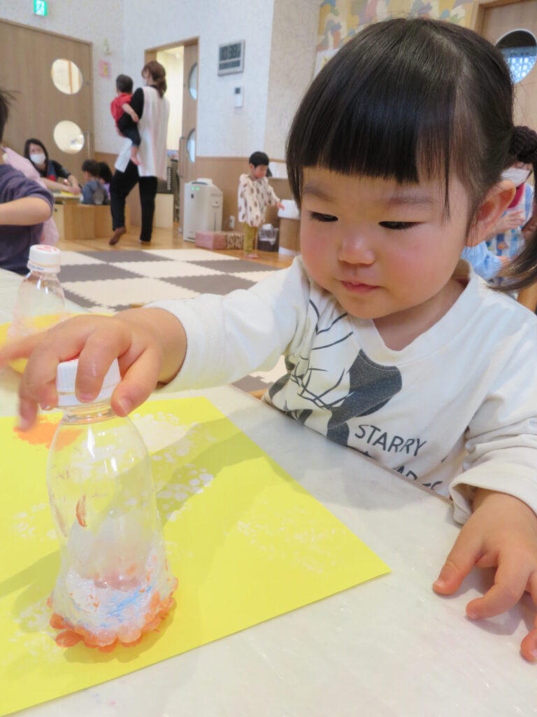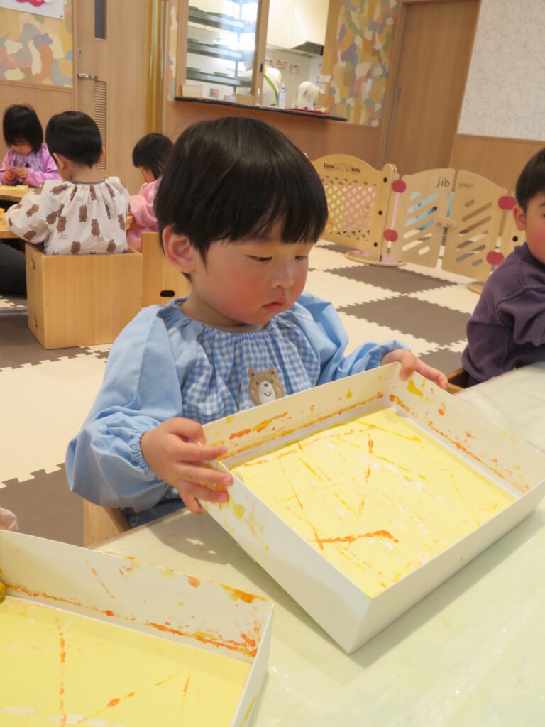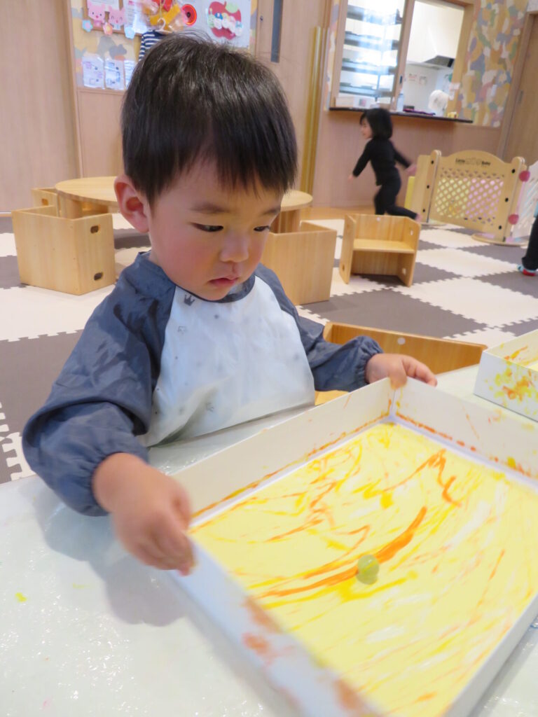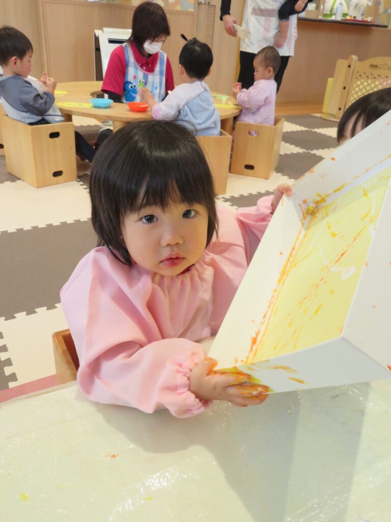 何度もやっているので、画用紙いっぱいに絵の具をつけて楽しんでいました。