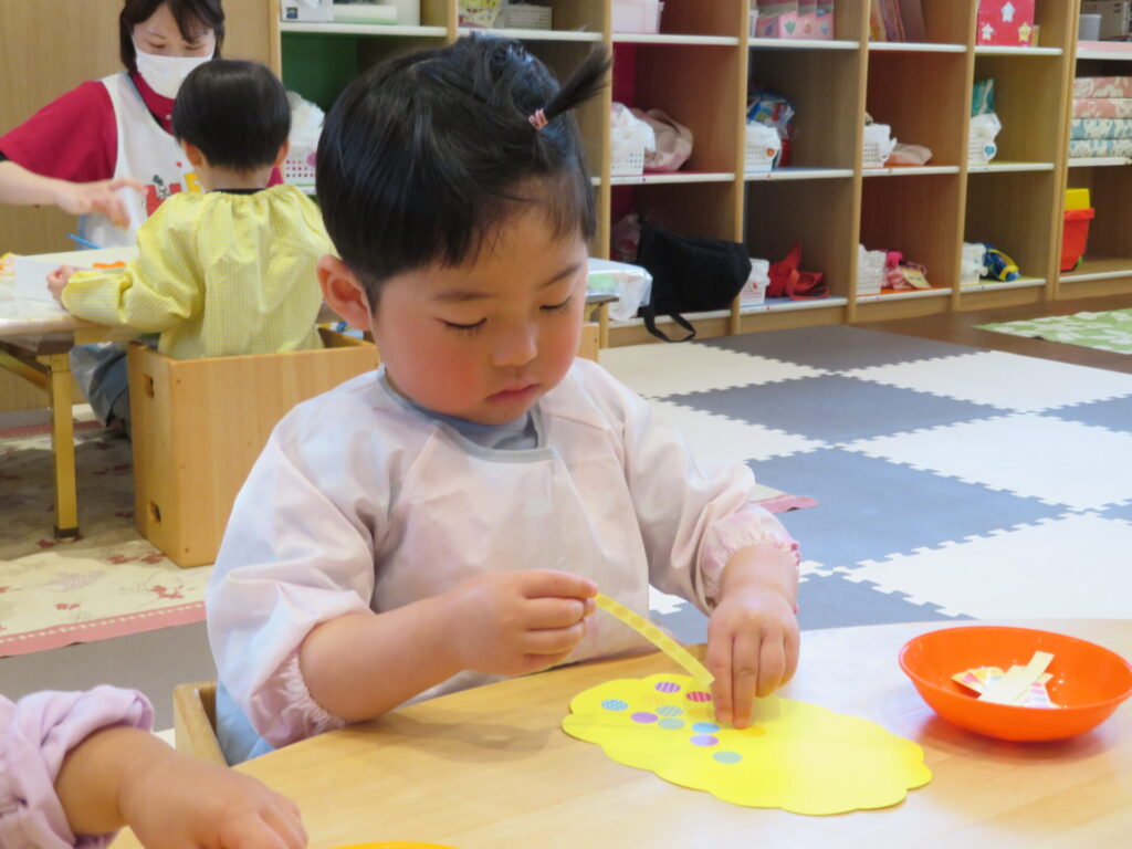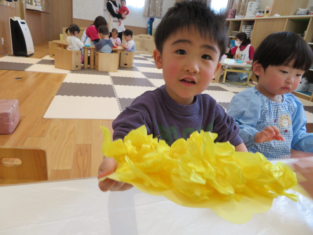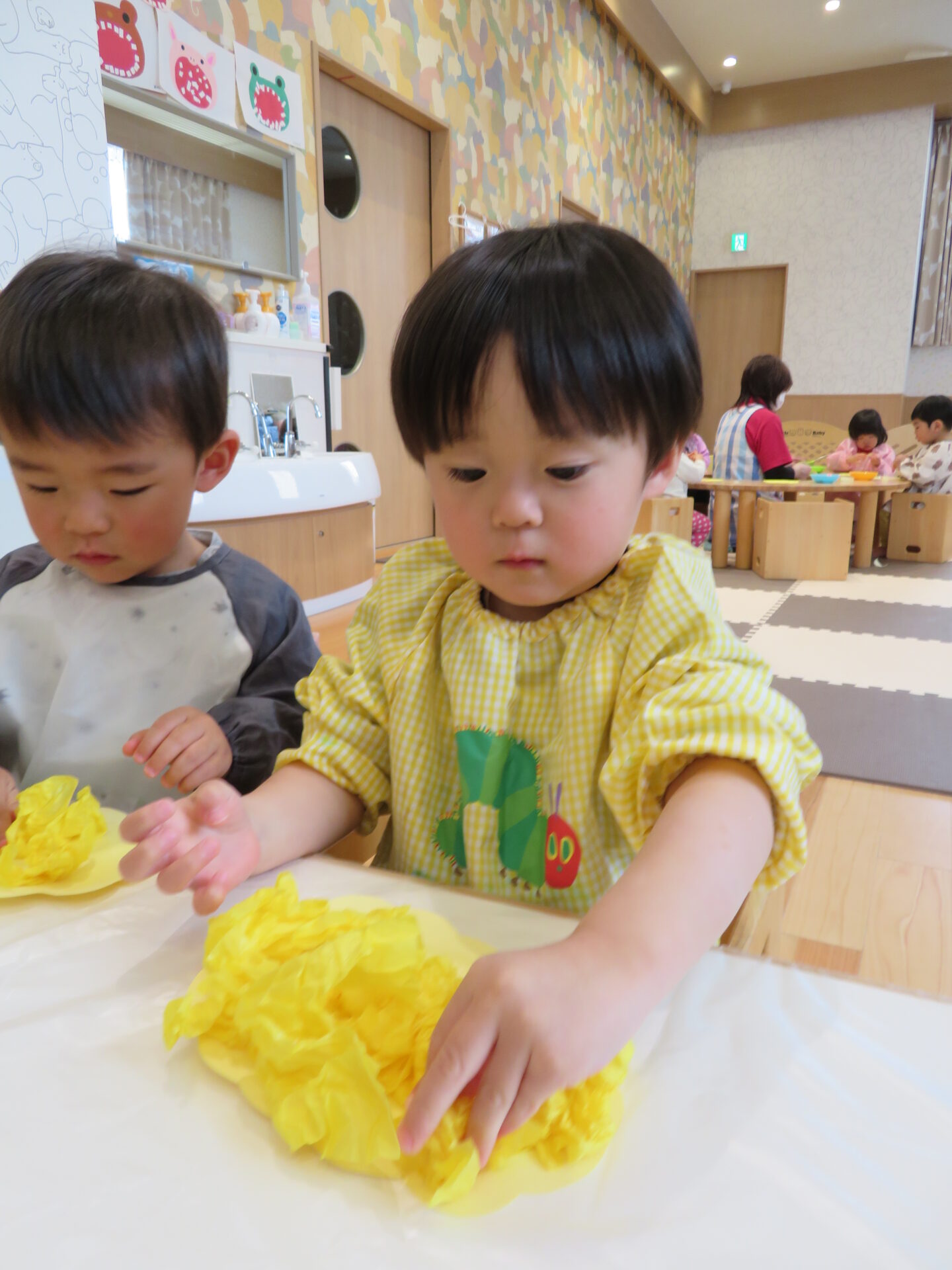 小さいお友だちは、お花紙の感触を確かめるように、優しく握って貼っていました。
