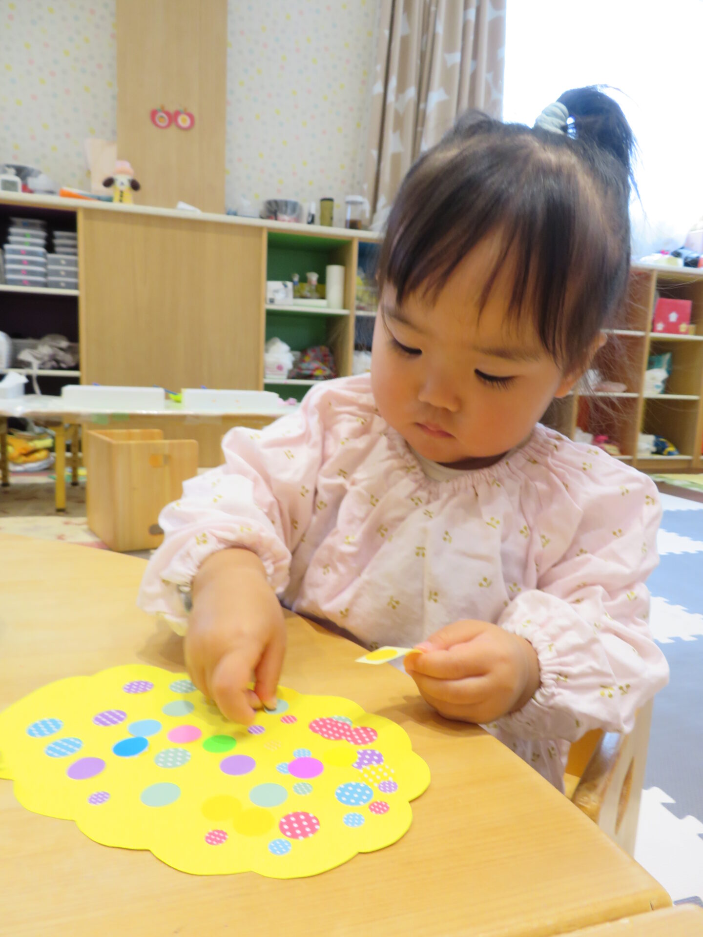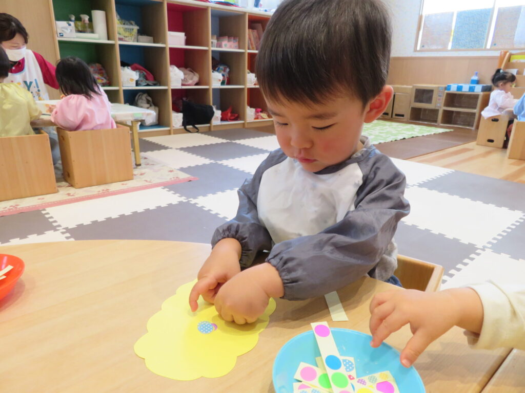 椅子に座り、小さな手で一生懸命シールを貼る子どもたち(^^)
