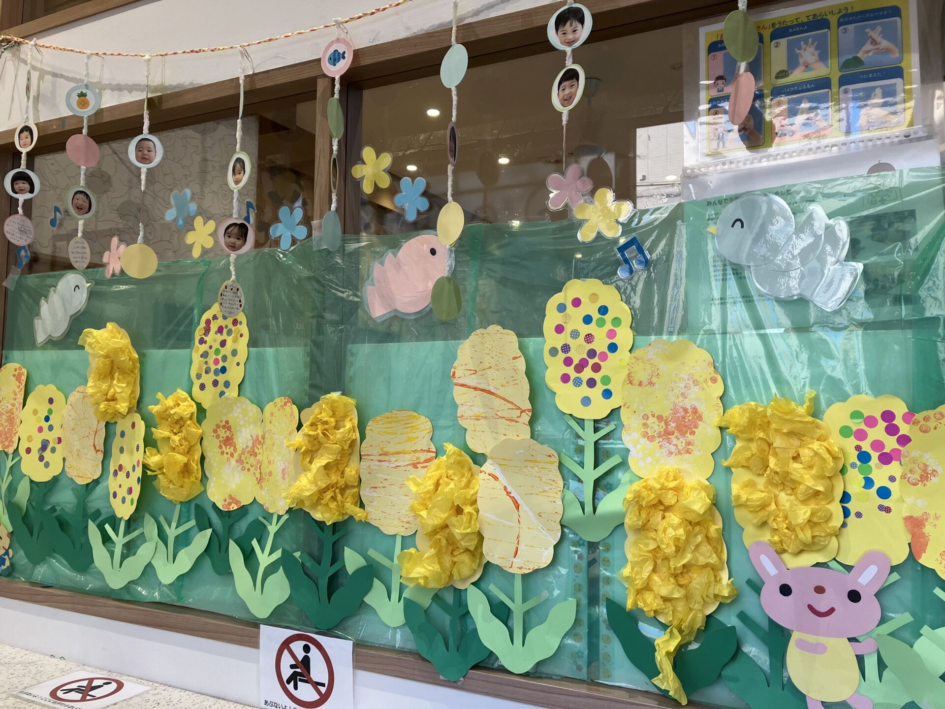 黄色い小さな花びらがたくさんついている菜の花を、春の壁面としてみんなで作りましたよ。
