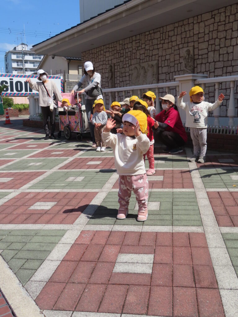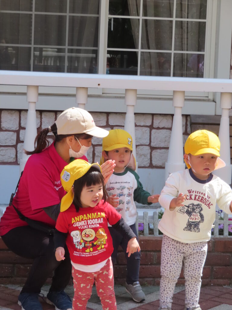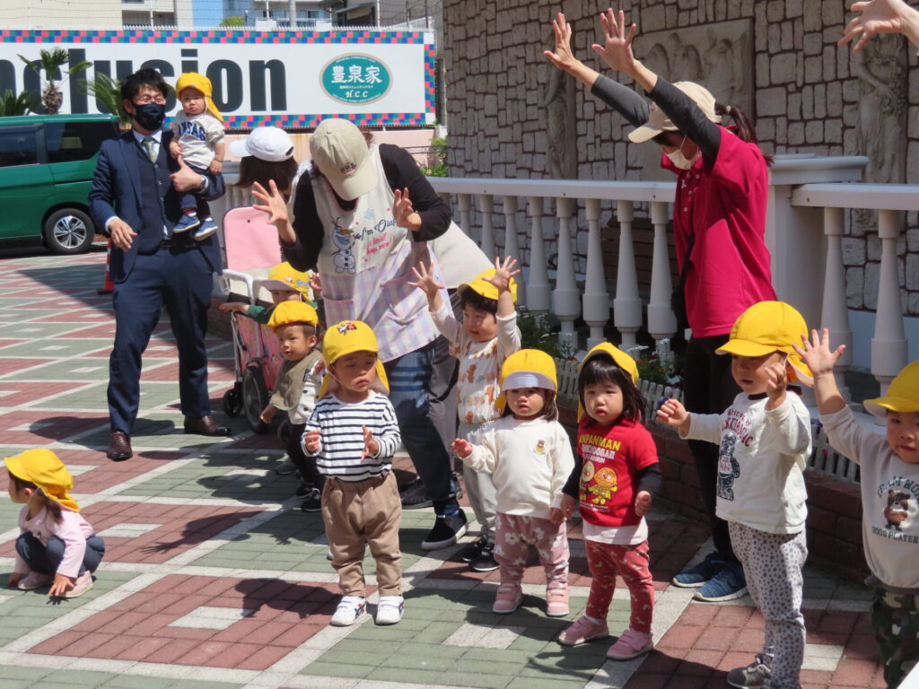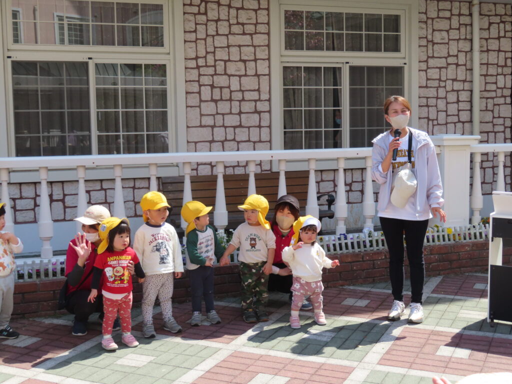 暖かいを通り越して暑いくらいの晴天の下、八重桜が咲き誇る敷地内で、日頃園で楽しんでいる「たけのこ体操」と「どうぶつ体操」を披露しましたよ~!