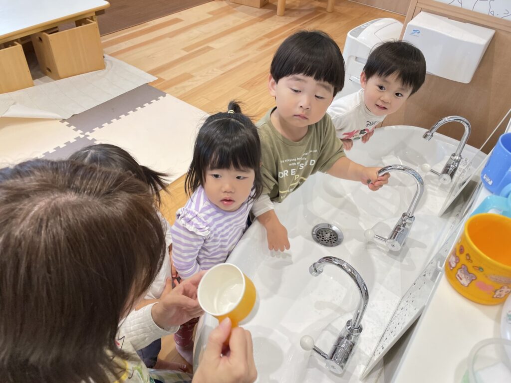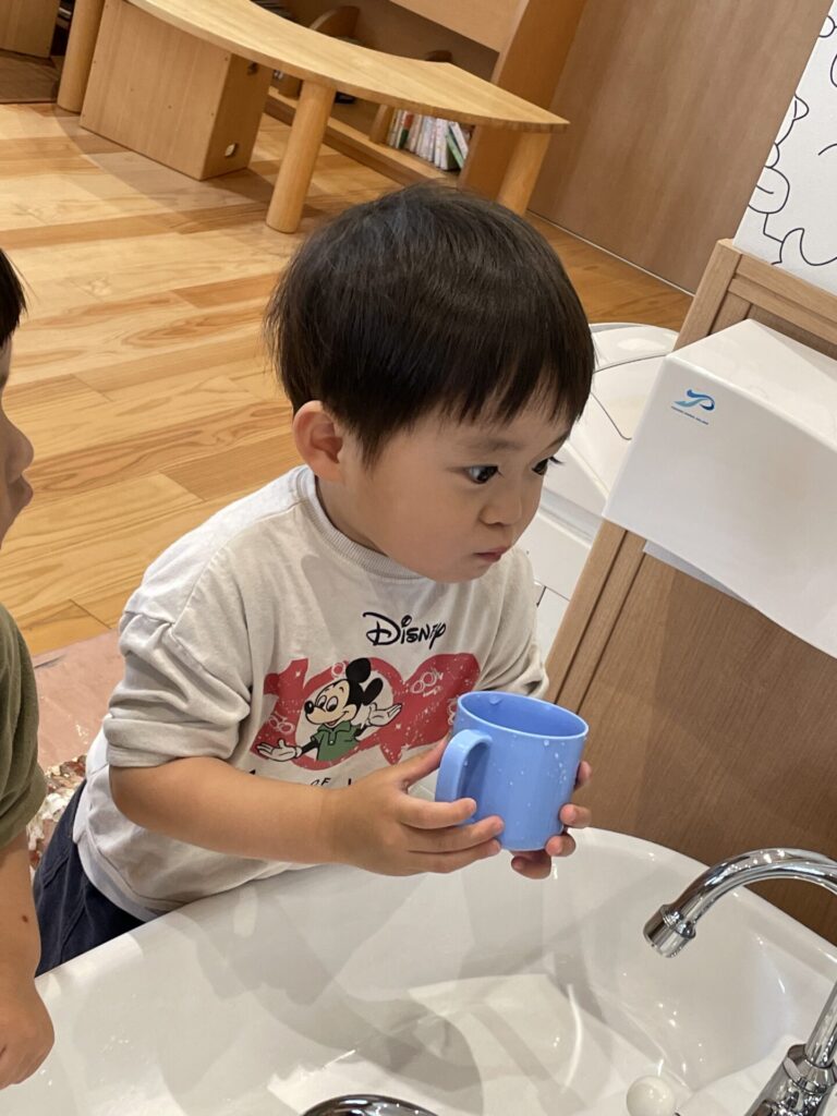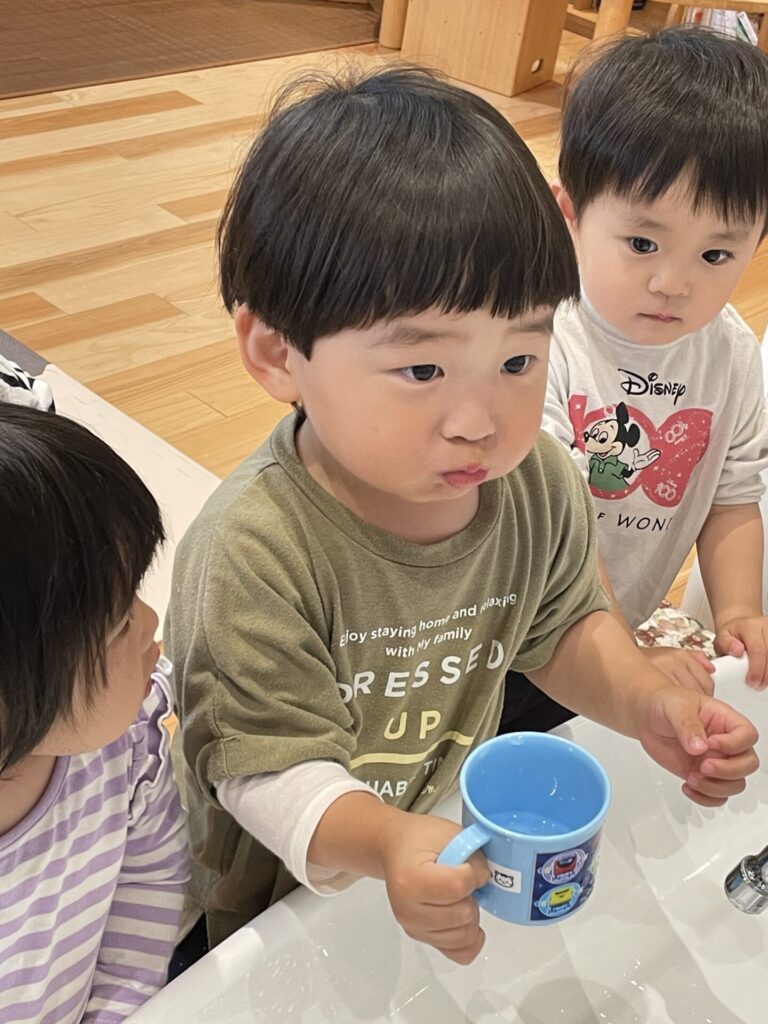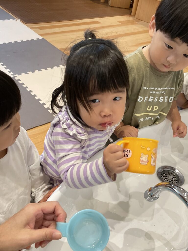 毎年、2歳にじ組さんに進級すると、うがいの練習をしています。